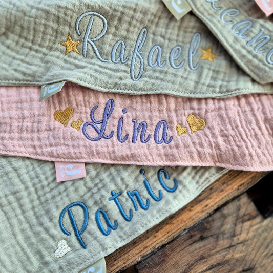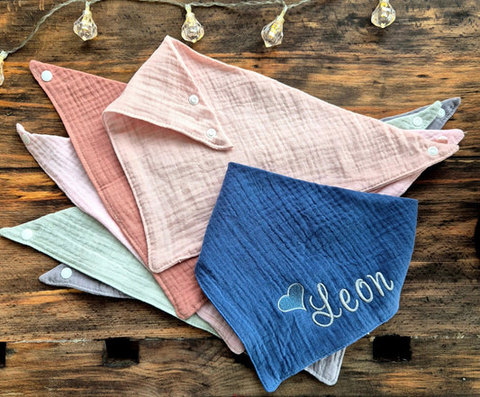 Besticktes personalisiertes Babyhalstuch | Bandanas aus Musselinstoff- verschiedene Farben